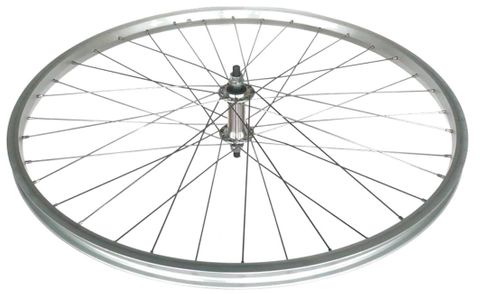 BICYCLE PARTS - WHEEL - FRONT 27.5/650B - SINGLE WALL SILVER ALLOY RIM, NUTTED ALLOY SILVER HUB (100MM O.L.D.) , 36 HOLESILVER STAINLESS STEEL SPOKES