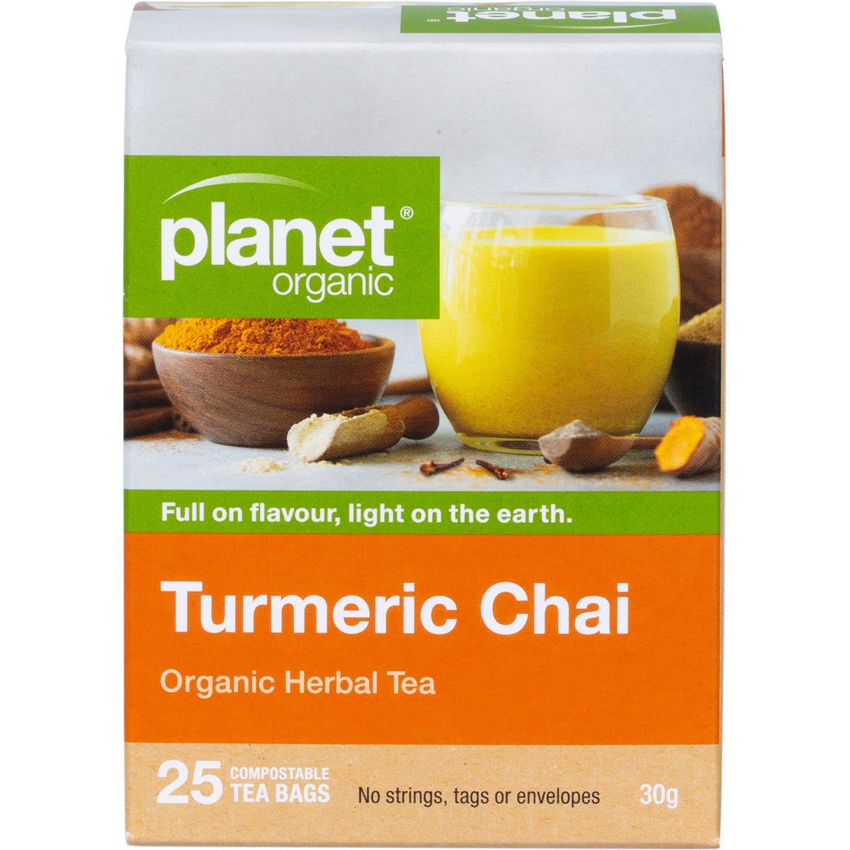 Description: Turmeric Chai Herbal Tea Bags<\br>Stockcode: PO138<\br>Brand: Planet Organic<\br>Size: 25pk<\br>Moq Cartons of 1<\br>Ingredients: Turmeric (60%), Cinnamon, Clove, Cardamom, Ginger, Nutmeg. Read more