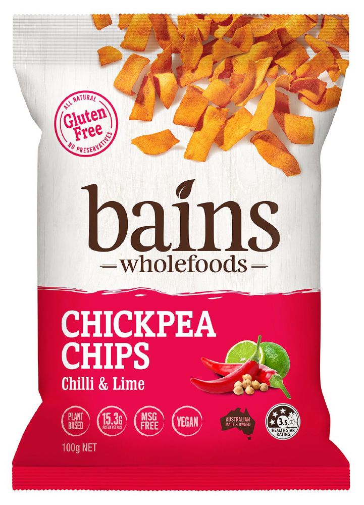 BAINS WHOLEFOODS CHICKPEA CHIPS CHILLI & LIME G/F 100G X 12