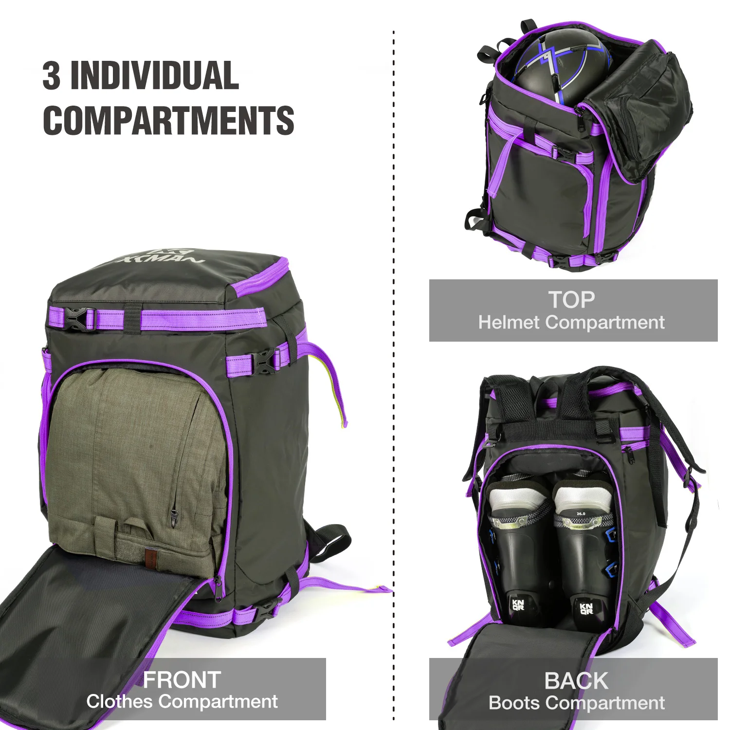 2.INDIVIDUAL COMPARTMENTS: 3 individual compartments and some pockets keep your gear organized in order and protected from clashing.Top is Helmet compartment and inner goggles pocket.Back is boots compartment measures in at 11.8 x 12.6 x 19.7 inches enough for US men’s ski boots up to size 12.5. Front is Clothes compartment to store your clothes.